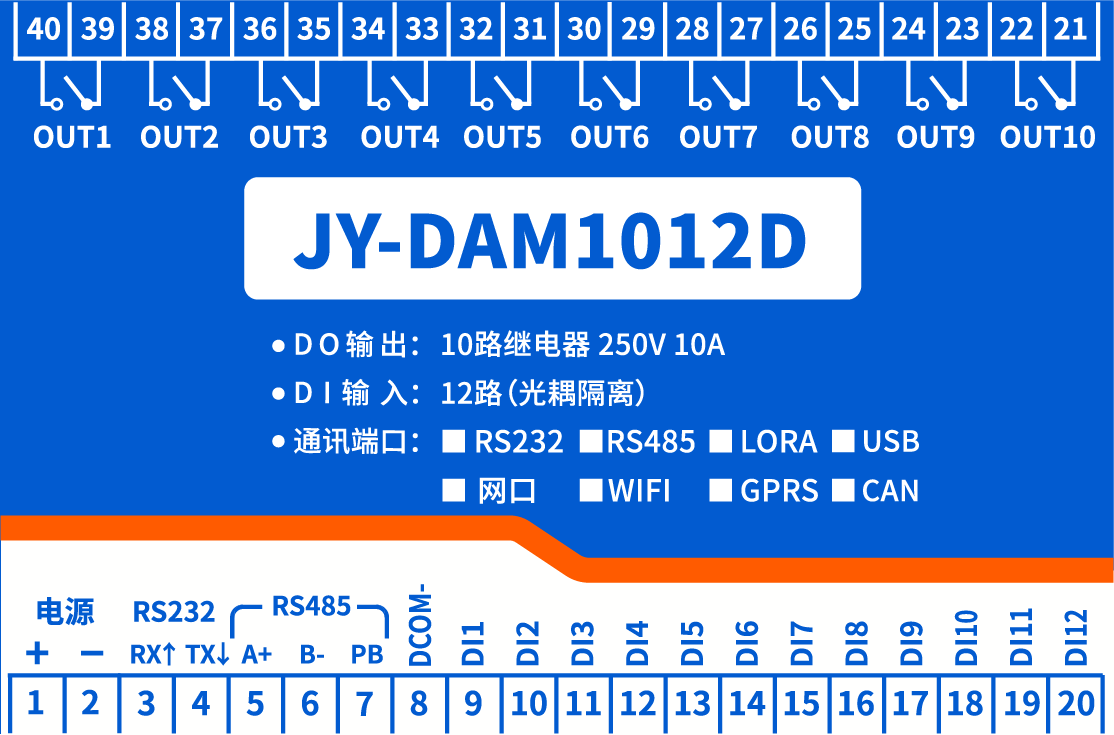 DAM1012D 工業(yè)級(jí)繼電器控制板,10路繼電器控制(DO)12路開(kāi)關(guān)量采集(DI) ,10路繼電器控制輸出,觸點(diǎn)隔離;12路開(kāi)關(guān)量輸入;支持RS232或隔離RS485通訊接口;標(biāo)準(zhǔn)Modbus協(xié)議,支持Modbus RTU/ASCII;支持點(diǎn)動(dòng)輸出,聯(lián)動(dòng)功...
