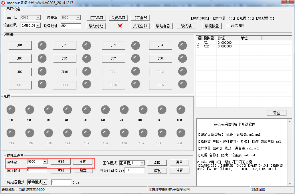 打開(kāi)“聚英翱翔DAM調(diào)試軟件”;串口設(shè)定欄:串口選擇您電腦對(duì)應(yīng)COM口,波特率選擇設(shè)備默認(rèn)波特率(9600)(未自己設(shè)置過(guò)波特率前),設(shè)備地址填寫(xiě)“254”(254為設(shè)備的廣播地址),設(shè)備型號(hào)選擇相對(duì)應(yīng)型號(hào),設(shè)置好以上設(shè)備的4個(gè)參數(shù)后點(diǎn)擊打開(kāi)串口,點(diǎn)擊繼電器按鈕“JD1”若繼電器反應(yīng)則連接成功。