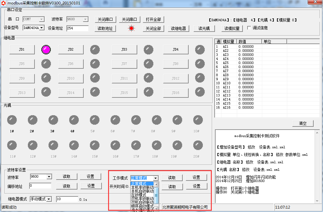 打開(kāi)“聚英翱翔DAM調(diào)試軟件” 點(diǎn)擊下方工作模式設(shè)置欄的“讀取”和“設(shè)置”就可以分別讀取和設(shè)置工作模式。