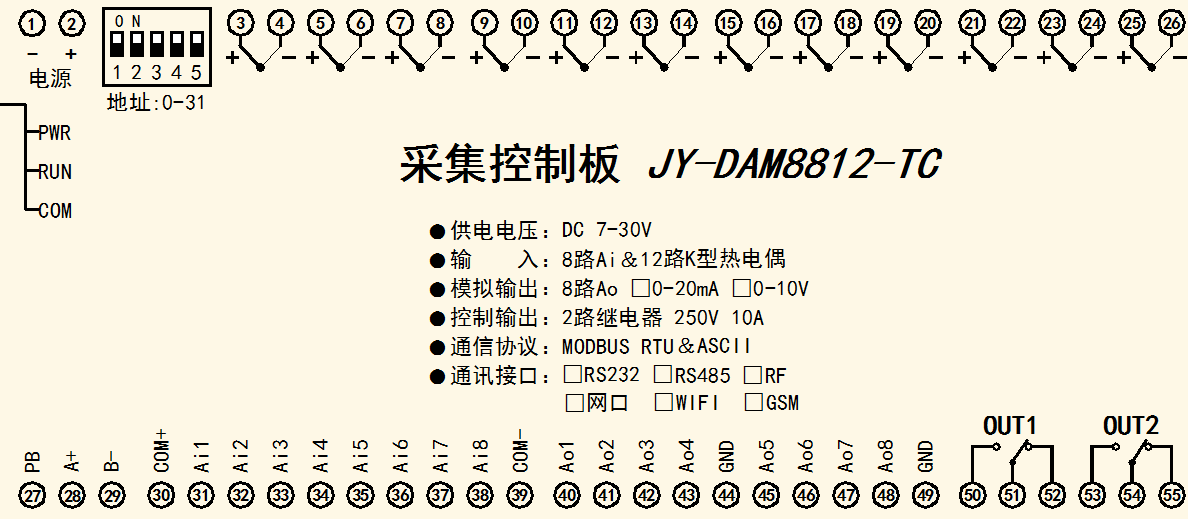 型號 | modbus | RS232 | RS485 | 模擬量輸入 | 繼電器 | 熱電偶 | 模擬量輸出 |
