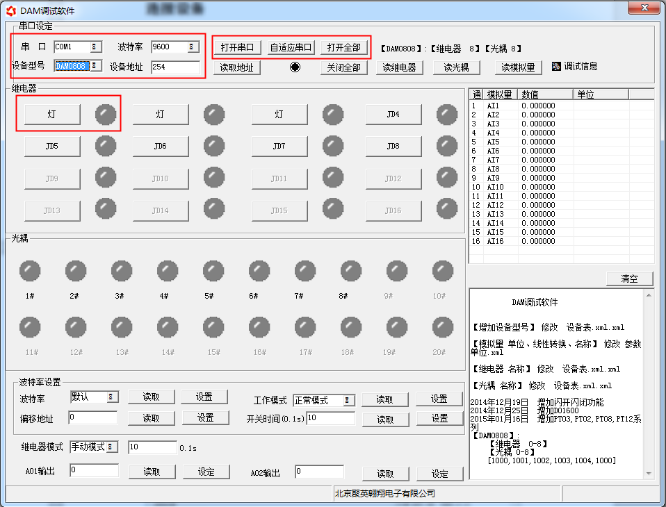 打開(kāi)“聚英翱翔DAM調(diào)試軟件”;串口設(shè)定欄:串口選擇您電腦對(duì)應(yīng)COM口,波特率選擇設(shè)備默認(rèn)波特率(9600)(未自己設(shè)置過(guò)波特率前),設(shè)備地址填寫(xiě)“254”(254為設(shè)備的廣播地址),設(shè)備型號(hào)選擇相對(duì)應(yīng)型號(hào),設(shè)置好以上設(shè)備的4個(gè)參數(shù)后點(diǎn)擊打開(kāi)串口,點(diǎn)擊繼電器按鈕“JD1”若繼電器反應(yīng)則連接成功。