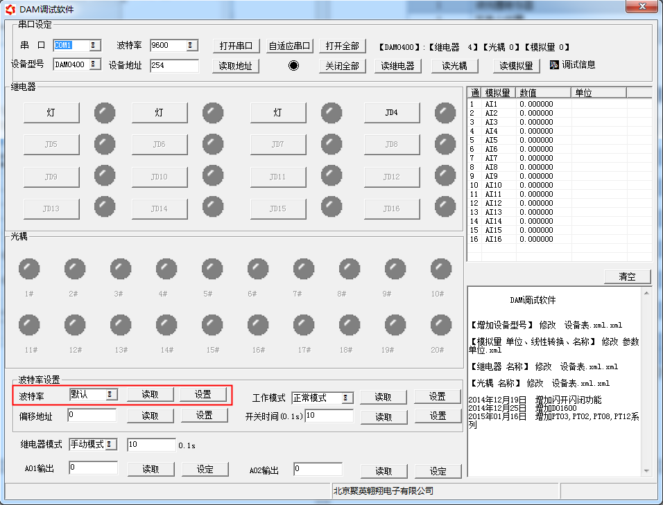 打開“聚英翱翔DAM調(diào)試軟件”;串口設(shè)定欄:串口選擇您電腦對應(yīng)COM口,波特率選擇設(shè)備默認波特率(9600)(未自己設(shè)置過波特率前),設(shè)備地址填寫“254”(254為設(shè)備的廣播地址),設(shè)備型號選擇相對應(yīng)型號,設(shè)置好以上設(shè)備的4個參數(shù)后點擊打開串口,點擊繼電器按鈕“JD1”若繼電器反應(yīng)則連接成功。