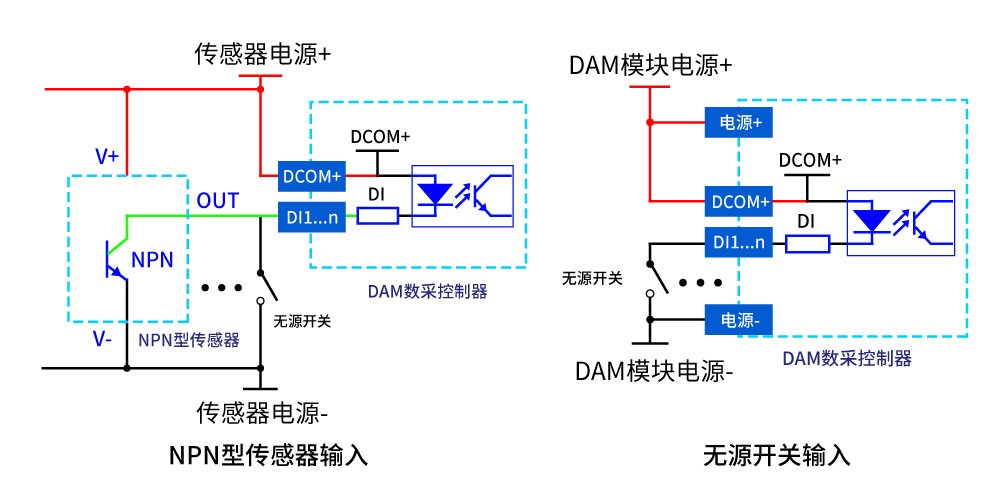 下圖中的電源部分為傳感器供電,AI1-AI8接傳感器信號(hào)正,ACOM-為傳感器信號(hào)負(fù),ACOM+不用。
