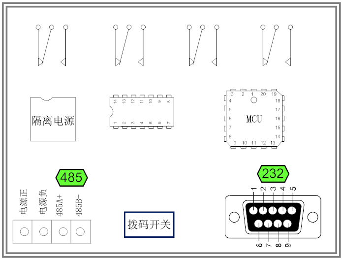 應用舉例及其說明:本機地址除了偏移地址地址之外,還有默認的254為廣播地址。當總線上只有一個設備時,無需關心撥碼開關地址,直接使用254地址即可,當總線上有多個設備時通過撥碼開關選擇為不同地址,發(fā)送控制指令時通過地址區(qū)別。