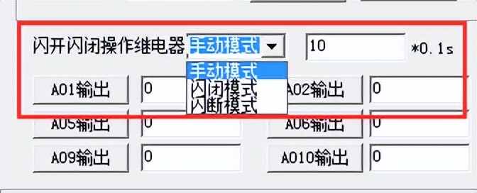 打開“聚英翱翔DAM調試軟件”點擊繼電器模式后面下拉箭頭進行模式的選擇。(后邊時間可自行設置,實際時間=填寫數(shù)字*0.1【單位秒】)