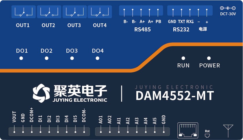 DAM4552-MT 工業(yè)級云系列網(wǎng)絡(luò)版 4路繼電器輸出(DO)5路開關(guān)量采集(DI)5路模擬量采集(AI)2路模擬量輸出(A0),4路繼電器控制輸出,觸點隔離;5路開關(guān)量輸入(NPN/干接點);5路模擬量(4-20mA、0-5V、0-10V)輸入;2路模擬量...