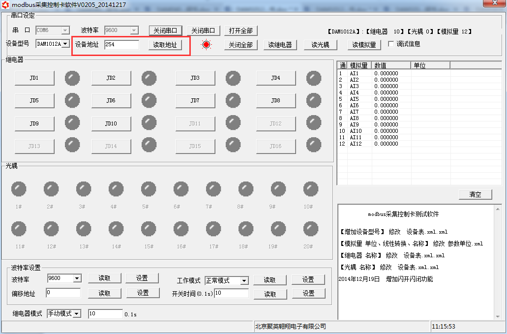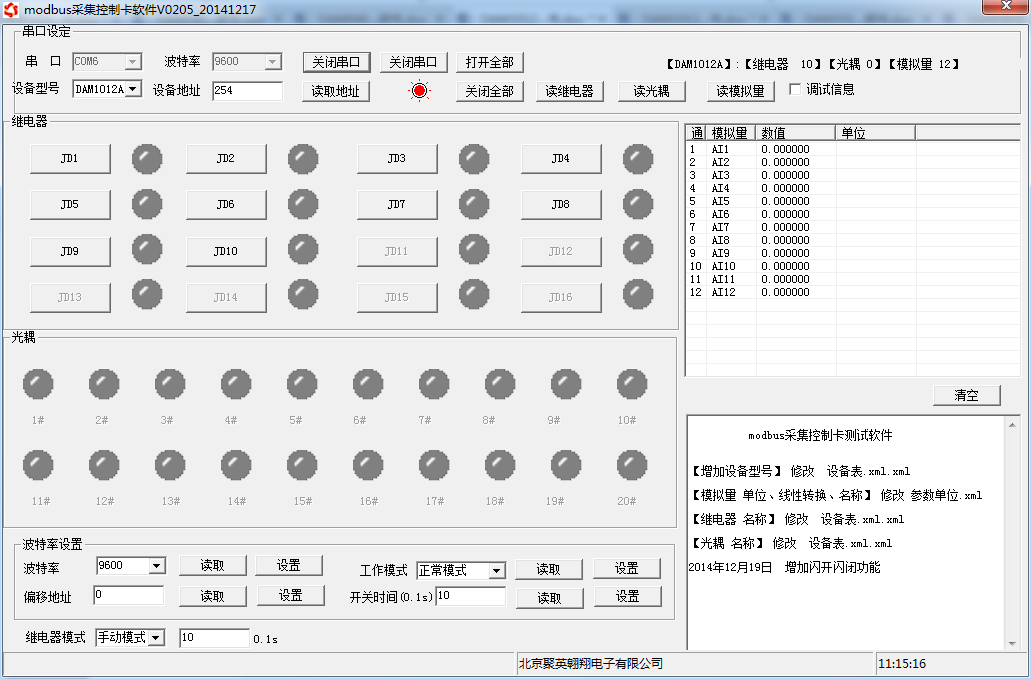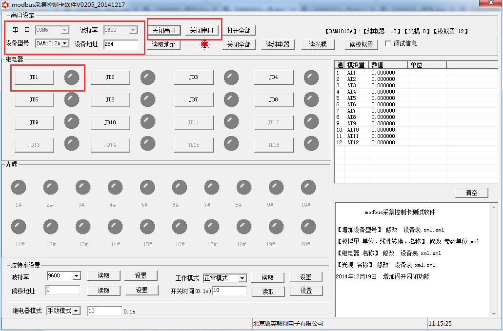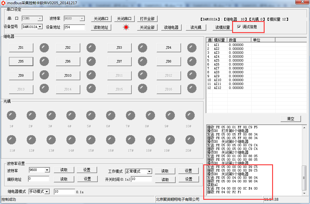 打開“聚英翱翔DAM調(diào)試軟件”;串口設定欄:串口選擇您電腦對應COM口,波特率選擇設備默認波特率(9600)(未自己設置過波特率前),設備地址填寫“254”(254為設備的廣播地址),設備型號選擇相對應型號,設置好以上設備的4個參數(shù)后點擊打開串口,點擊繼電器按鈕“JD1”若繼電器反應則連接成功。