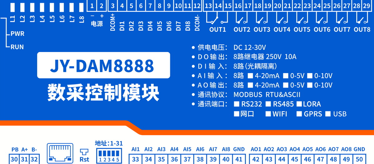 工業(yè)級(jí)繼電器控制板 8路繼電器控制(DO)8路模擬量采集(AI)8路開(kāi)關(guān)量采集(DI)8路模擬量輸出(AO),8路繼電器輸出;8路光耦輸入(5-24V) ;8路12位分辨率模擬量電壓輸入;8路模擬量輸出;支持RS232或隔離RS485通訊接口;標(biāo)準(zhǔn)Modbu...
