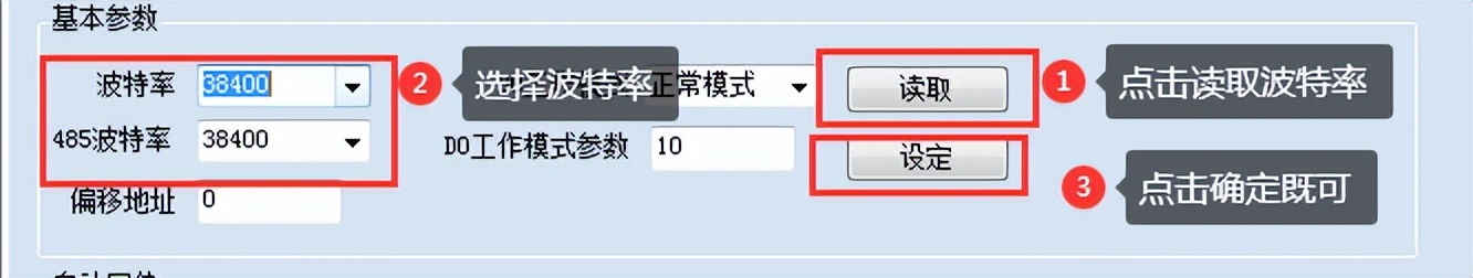 點(diǎn)擊下方波特率設(shè)置欄的“讀取”和“設(shè)置”就可以分別讀取和設(shè)置波特率和地址,操作后需要重啟設(shè)備和修改電腦串口設(shè)置。