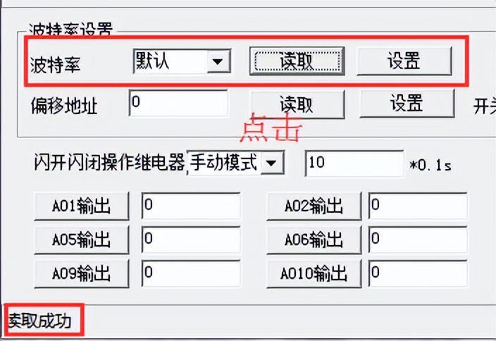 點(diǎn)擊下方波特率設(shè)置欄的“讀取”和“設(shè)置”就可以分別讀取和設(shè)置波特率和地址,操作后需要重啟設(shè)備和修改電腦串口設(shè)置。