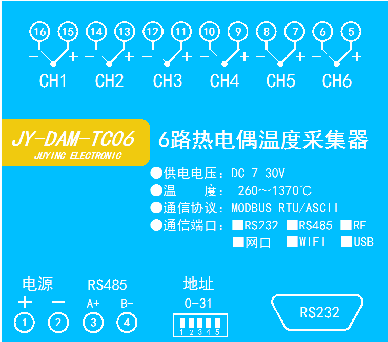 6路K型熱電偶溫度數(shù)據(jù)采集 GPRS-TC06 工業(yè)級溫度采集模塊,●高精度24位AD轉(zhuǎn)換分辨率0.1●測溫精度1C●采集頻率10Hz●支持多路同時(shí)采集