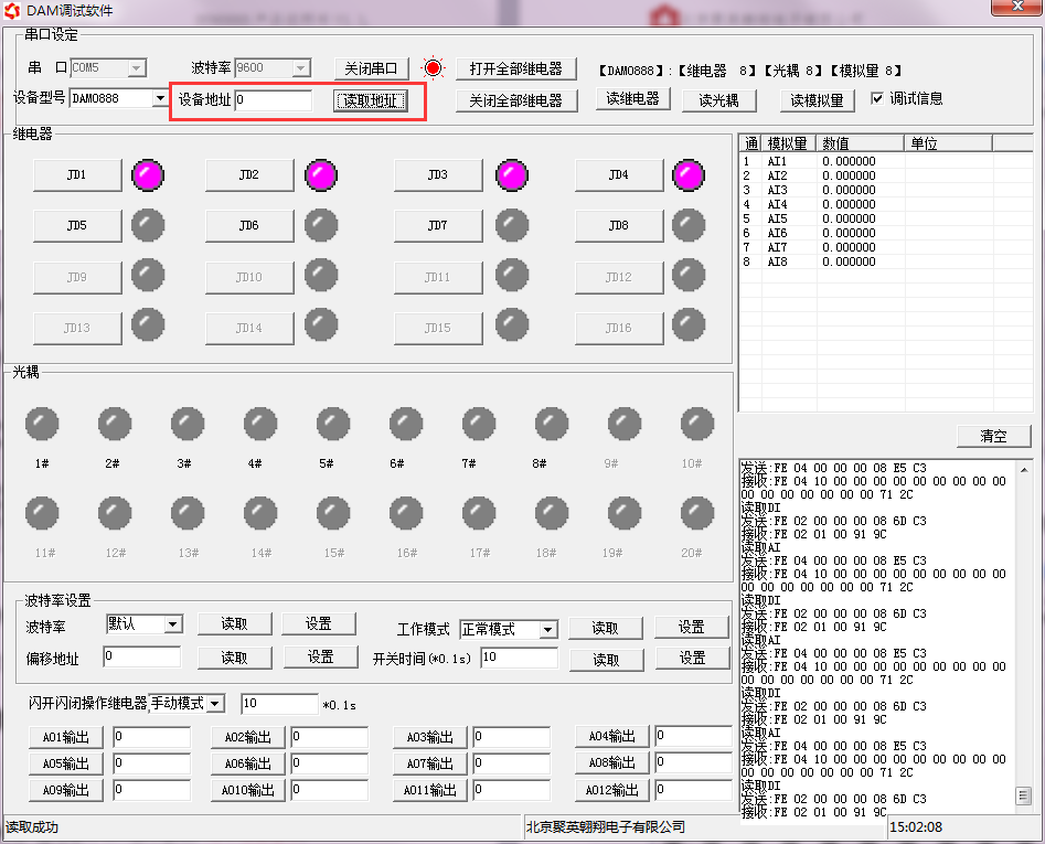 點擊DAM調(diào)試軟件下方偏移地址后邊的“讀取”或“設(shè)置”來對設(shè)備的偏移地址進行讀取或設(shè)置。
