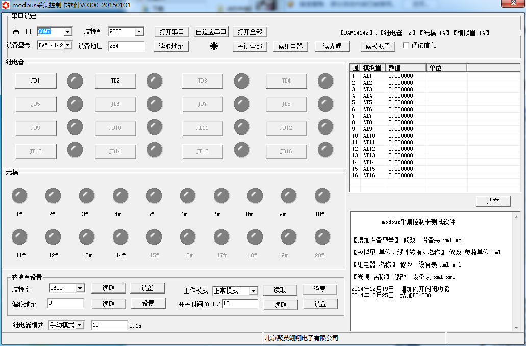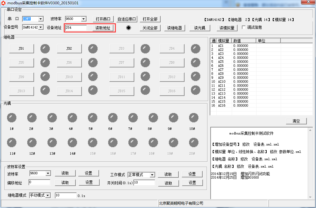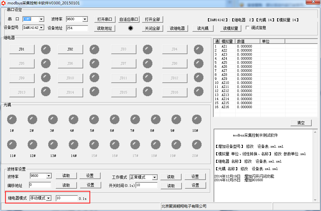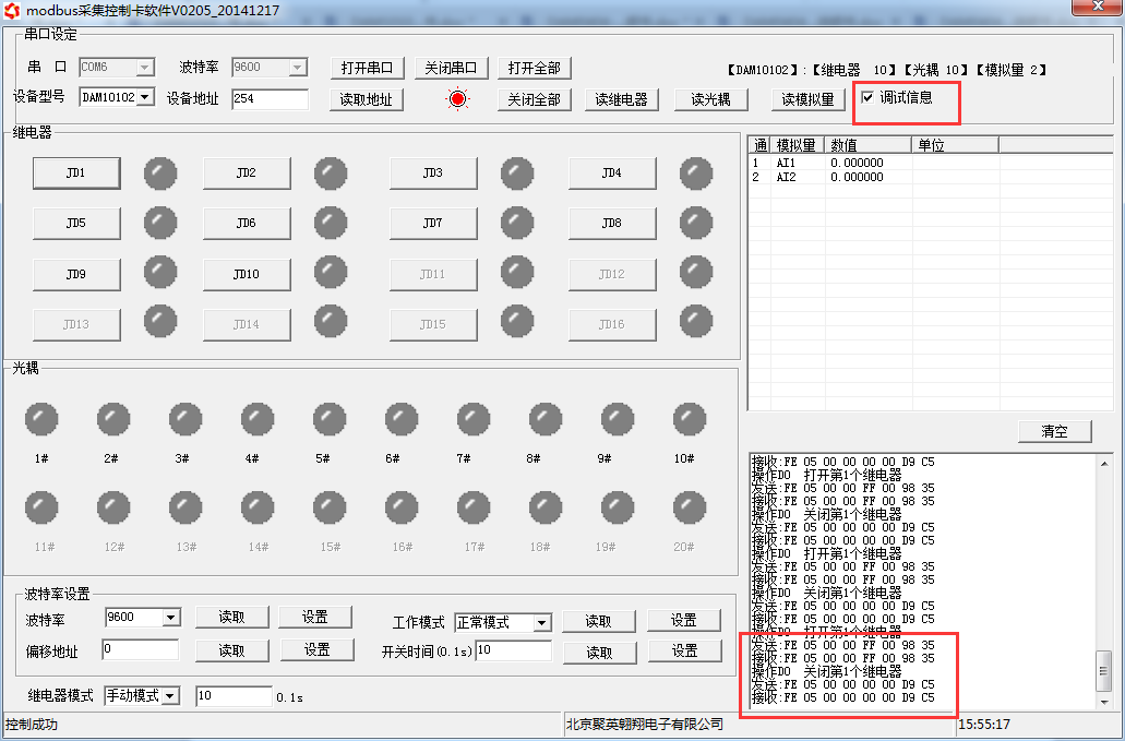 打開“聚英翱翔DAM調(diào)試軟件”;串口設(shè)定欄:串口選擇您電腦對(duì)應(yīng)COM口,波特率選擇設(shè)備默認(rèn)波特率(9600)(未自己設(shè)置過波特率前),設(shè)備地址填寫“254”(254為設(shè)備的廣播地址),設(shè)備型號(hào)選擇相對(duì)應(yīng)型號(hào),設(shè)置好以上設(shè)備的4個(gè)參數(shù)后點(diǎn)擊打開串口,點(diǎn)擊繼電器按鈕“JD1”若繼電器反應(yīng)則連接成功。