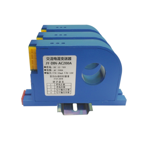 JY-DIN-AC200A/300A交流電流變送器是組合電流互感器、電流變送器于一體的新一代交流電流變送器,它可以直接將被測(cè)主回路交流電流轉(zhuǎn)換成按線性比例輸出的DC4~20mA(通過(guò)250Ω 電阻轉(zhuǎn)換DC 1~5V或通過(guò)500Ω電阻 轉(zhuǎn)換DC2~10V)恒流環(huán)標(biāo)準(zhǔn)信號(hào),連續(xù)輸送到接收裝置(計(jì)算機(jī)或顯示儀表)。交流電流變送器單匝穿孔穿芯式結(jié)構(gòu),使用時(shí)無(wú)需改動(dòng)測(cè)量主回路,便于現(xiàn)場(chǎng)連接,原副邊高度絕緣隔離,兩線制輸出接線,輔助工作電源+24V與輸出信號(hào)線DC4~20mA共用. 交流電流變送器具有精度高,體積小、功耗小、頻響寬、抗干擾功能。電流變送器用于測(cè)量電網(wǎng)中波形畸變較嚴(yán)重的信號(hào),也可以測(cè)量方波,三角波等非正弦波形。
